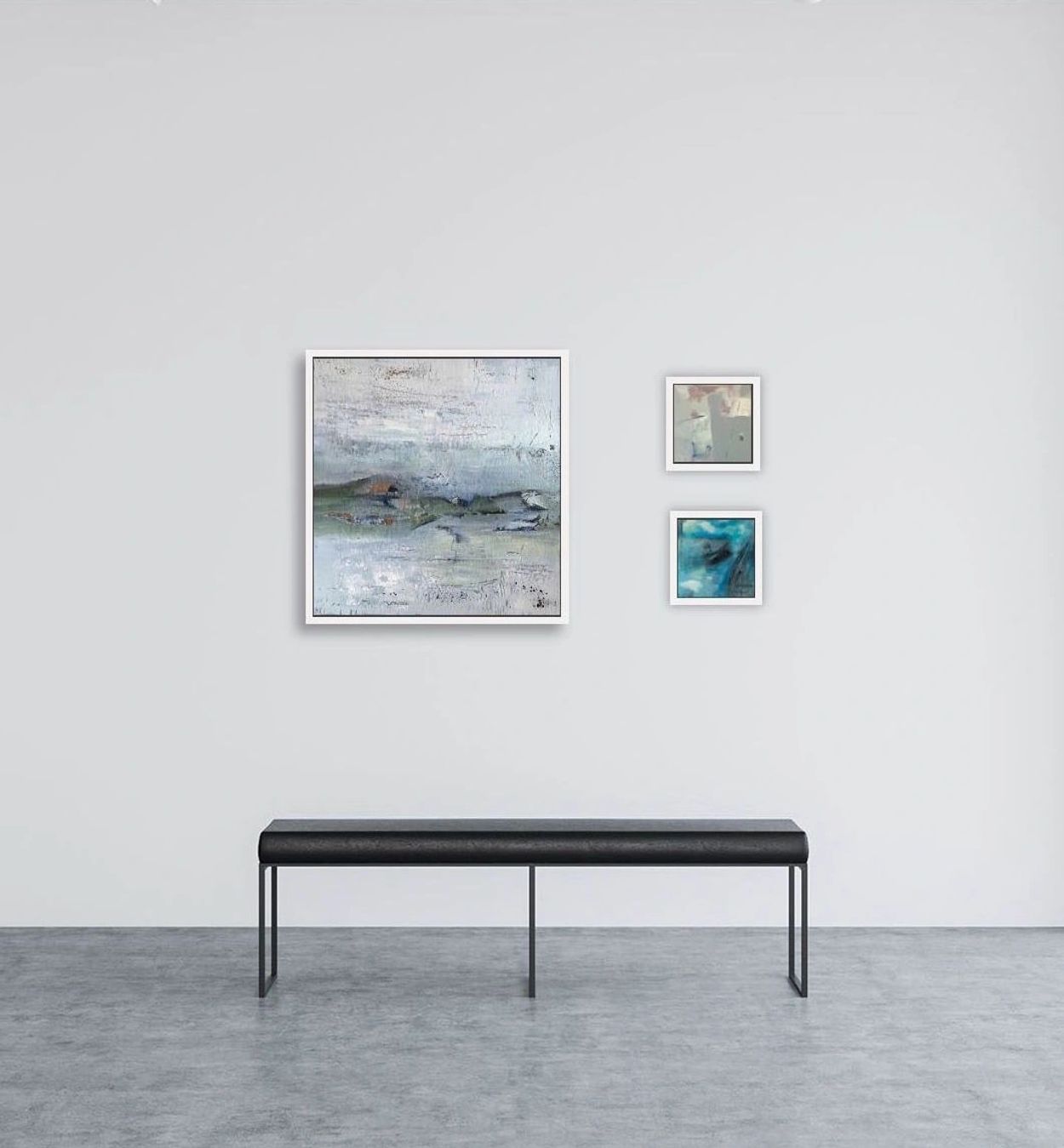 From left to right: Quiet Expanse, Acrylic on canvas, 40" x 40" • Top right: Wing View, Acrylic on canvas, 12" x 12" • Bottom right: At The Waters Edge, Acrylic on canvas, 12" x 12"