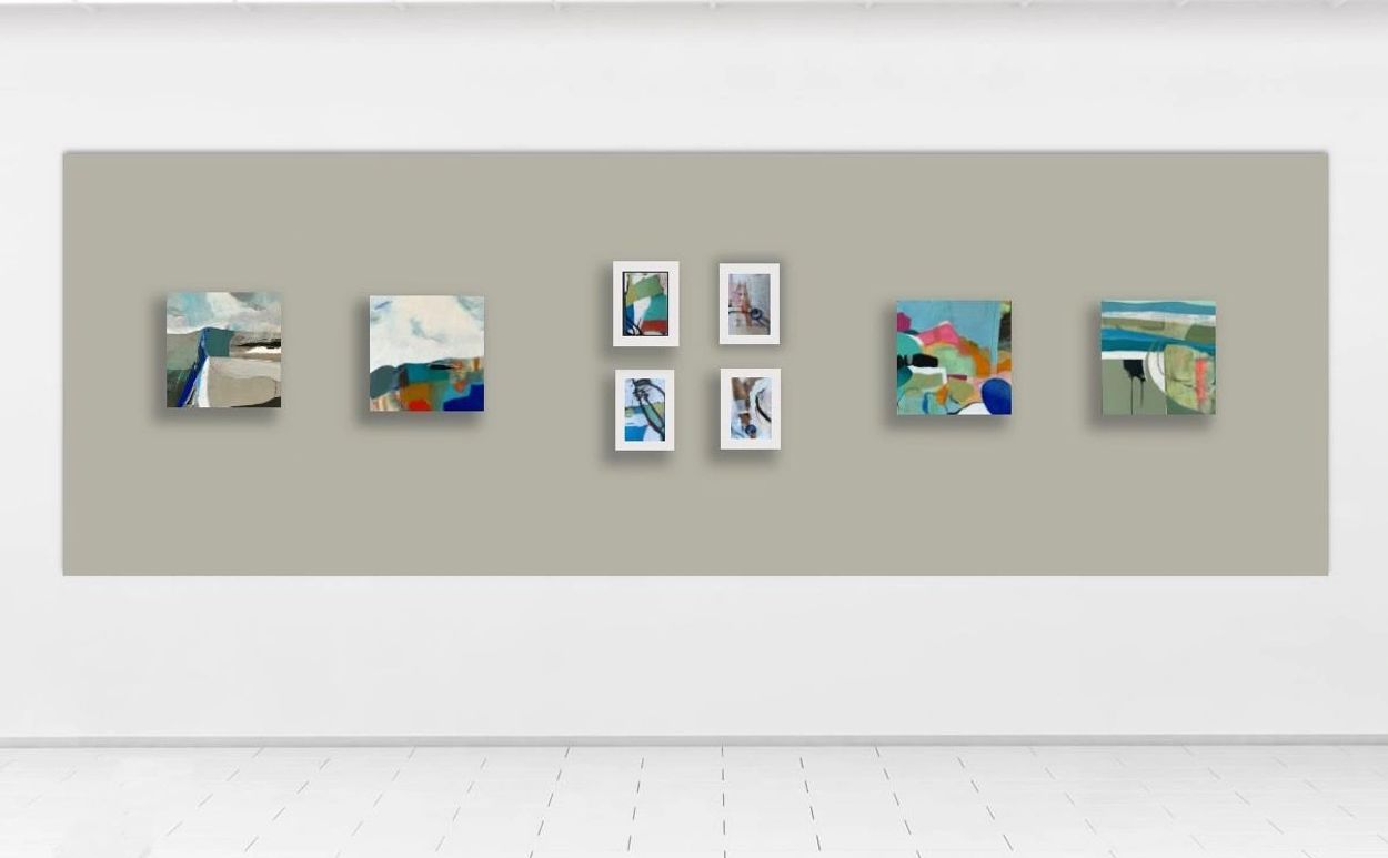 Left wall: Wide Expanse, Acrylic on canvas, 48" x 36" • Right wall: Top - Inside, Acrylic on canvas, 12" x 12" • Bottom - Wade With Me Into The Grotto, Acrylic on canvas, 12" x 12"