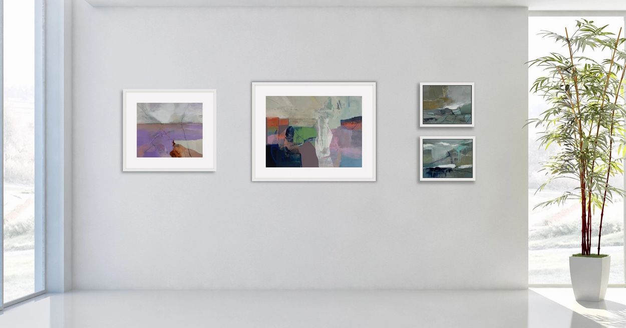 From left to right: From a Distance, Acrylic on canvas, 24" x 20" • Mystic Valley, Acrylic on canvas, 40" x 30" • Top - Wandering, Acrylic on canvas, 14" x 11" Bottom - Wandering in the Rain, Acrylic on canvas, 14" x 11"