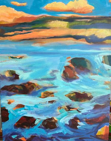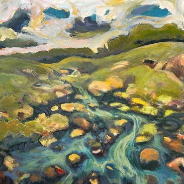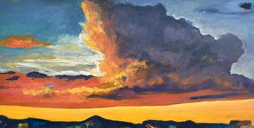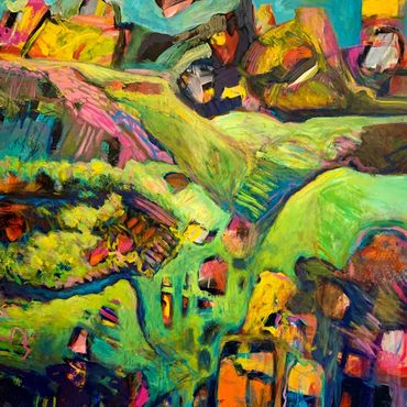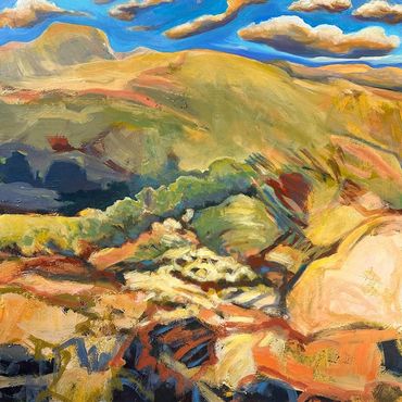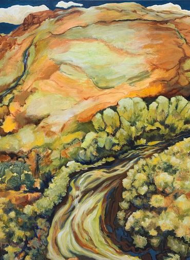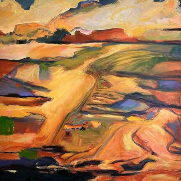 Drawn to the beauty of the natural world, her paintings explore the landscape with a distorted and abstract perspective. The landscape and weather of southern Arizona are often her inspiration while the images come from imagination and are rarely a representation of an actual place, focusing more on how a place feels than what it looks like. Her work explores a sense of place, how we engage with the landscape, searching for those moments that feel like home. She creates intuitively, allowing the process to direct the art-making experience. Following the path of the expressionist painters, those who attacked their canvases with vigorous gestural expressionism, her art is grounded in personal experience, celebrating life with bold colors and sensual shapes.