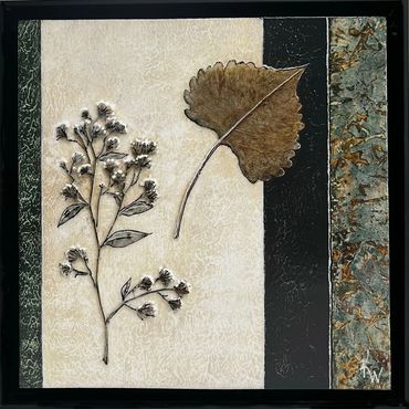 “One day while resting on a mountain trail a breeze wrapped around me and it felt like a hug. I looked up and all around and it became crystal clear that nature reflects not just beauty but also hope and inspiration and healing as well as many metaphoric lessons that can touch all of our lives in profound and limitless ways. We are all warmed by the same sun and held by the same gravity. I knew I wanted to share these feelings as well as the actual botanicals with the world. I stopped many times on my walk home that day and picked up random botanic elements not knowing how, but still knowing these elements would become part of my art.”