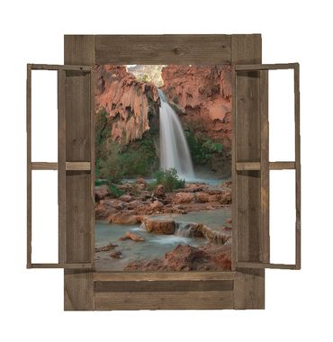 Custom frames are built from 1x4 Barnwood Boards. Shutters have plexiglass windows and cabinet hinges. The back has gallery standard sealed finish and hangs via French Cleat.